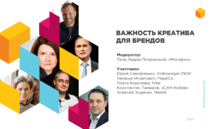 Рекламодатели также примут участие в отдельной дискуссионной панели «Важность креатива для брендов», где представители известных российских и международных компаний – Volkswagen, PepsiCo, «САН ИнБев», Nestlé, Nike, – обсудят задачи брендов при создании рекламных кампаний, эффективность кейсов и метрики KPI, нюансы работы с агентствами и технологии, которые привлекают клиентов. Завершит дискуссию жаркий баттл «Бюджет VS Креатив», где станет известен ответ на главный вопрос: что важнее для создания ярких и, главное, эффективных проектов. Модератор панели: Петр Лидов-Петровский, PR-директор «Мегафон».