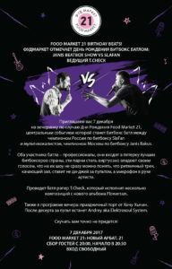 Центральным событием вечеринки Food Market 21 Birthday Beats – празднования четырехлетия фудмаркета на Новом Арбате – станет битбокс батл между чемпионом России по битбоксу SlaFan (aka Вячеслав Силаев) и мультивокалистом, чемпионом Москвы по битбоксу Janis Beatbox Show (aka Янис Бакус). Ведущий – T.Check.
