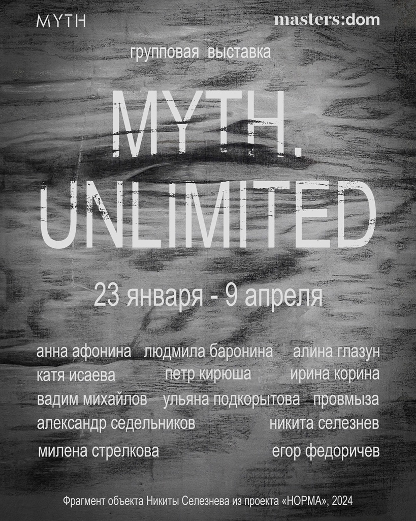 23 января MYTH Gallery совместно с образовательным проектом masters представит выставочный проект ‘MYTH. Unlimited’ в пространстве masters:dom. Проект станет вторым в стенах пространства и первым сторонним: на трех этажах будут показаны работы тринадцати художников MYTH Gallery — как новые, созданные специально для выставки, так и демонстрировавшиеся ранее лишь эпизодически.