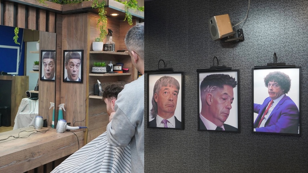 Парикмахерская G11 Barbers в районе Партик объединилась с уличным художником Rebel Bear, чтобы превратить обвинения в рекламную кампанию. На витринах появились портреты самого Фараджа — но с такими прическами, что политик вряд ли обрадовался бы знакомству со своим парикмахером: афро, маллет и прическа «шторы» украсили фасад на Дамбартон-роуд.