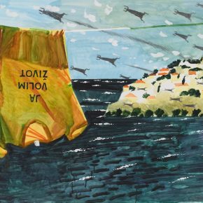 На стенах мы видим серию из семи ассамбляжных работ: облака, зеленые поля, предметы повседневности (кровать, стул, велосипед, дверь, лестница) и сам хлеб. Каждая сцена построена как мини-притча: облако льет дождь денег, лестница уходит в небесную синеву, дверь открывает портал «туда» и «сюда». Простая пиктограммная композиция отсылает и к иконописи (лаконичность, фронтальность), и к детскому рисунку или комиксу. Здесь соединяются бытовое и метафизическое, серьезное и ироничное.