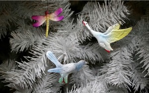 Эта группа предметов самая древняя. Подобные игрушки существовали еще до Революции, и были популярны вплоть до 1937-го года, когда появились первые фабрики елочных украшений. На фото – восстановленная реплика предметов 1930-х годов. Плоские картонные и деревянные фигурки сначала были самодельными, а затем самыми дешевыми в производстве. Интересный предмет – стрекоза, ведущая свою традицию от изящной дореволюционной эпохи модерна.