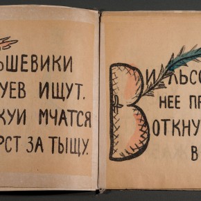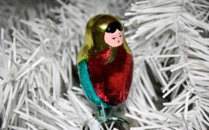 Сама игрушка матрешки родом из 50-х, но ее раскраска вдохновлена достижением научно-технического прогресса конца 1970-х – цветным телевизором. Цвета, в которые окрашена фигурка с нарушением архитектурной логики изображаемого – это так называемая система RGB, красный-зеленый-синий. Правда, вместо зеленого использован темный оттенок золотого, подчеркнутый изумрудным кантом.