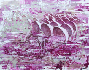 Работы Шандора Саса – это визионерские предсказания, насмешки над многочисленными прогнозами, которые строят ученые и футурологи наших дней. В основу его творчества легла реальная история небольшой деревеньки близ озера Безид (Трансильвания), жители которой вынуждены были покинуть родные дома из-за сооруженной неподалеку плотины. Изменения уклада жизни, природы и людей происходили постепенно и неизбежно со скоростью подступающей воды. Для художника этот процесс равносилен незаметной потере идентичности, поэтому персонажи его картин лишены лиц, да и любых других отличительных признаков: пола, возраста и социального статуса. В представленной серии герои блуждают на руинах парка развлечений и увлеченно конструируют различные устройства из обломков разрушенных аттракционов.