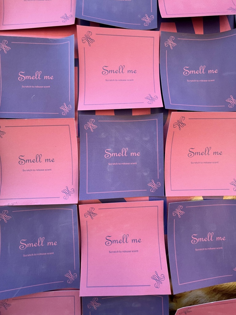 Розовые и фиолетовые отрывные карточки имеют квадратный формат 105 × 105 мм и имитируют носовой платок. В углах — монограмма Марии-Антуанетты. Они выделяют аромат при трении, а на обратной стороне можно прочитать о выставке.